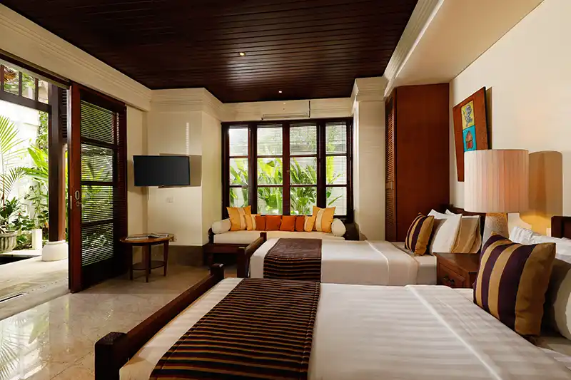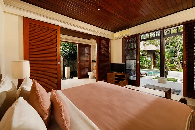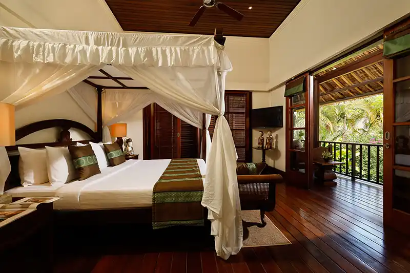 Villa Nayra is a luxurious three-bedroom villa with bedrooms on a two-story pavilion. The bedrooms offer maximum comfort and effortless luxury. The master bedroom is on the top floor and features a four-poster king bed, an oversized white marble bathtub, an extended wash basin and shower facilities, with an extended L-shaped balcony overlooking the pool garden and its lush surroundings.