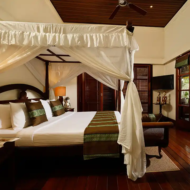 Villa Nayra is a luxurious three-bedroom villa with bedrooms on a two-story pavilion. The bedrooms offer maximum comfort and effortless luxury. The master bedroom is on the top floor and features a four-poster king bed, an oversized white marble bathtub, an extended wash basin and shower facilities, with an extended L-shaped balcony overlooking the pool garden and its lush surroundings.